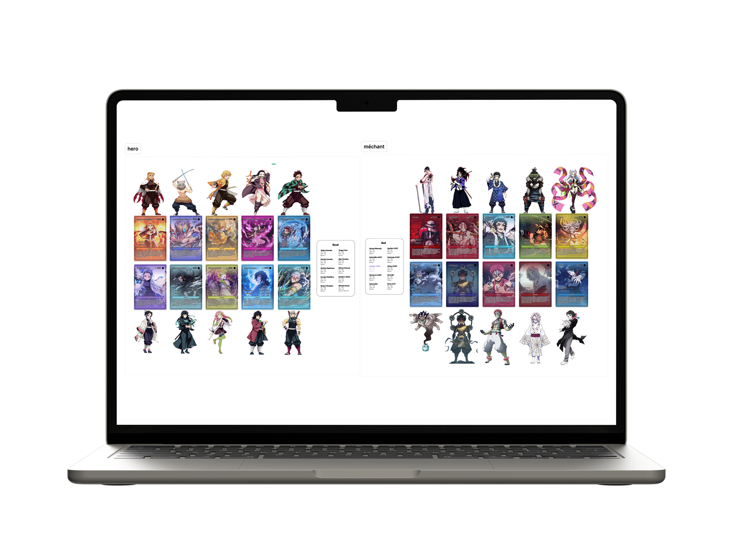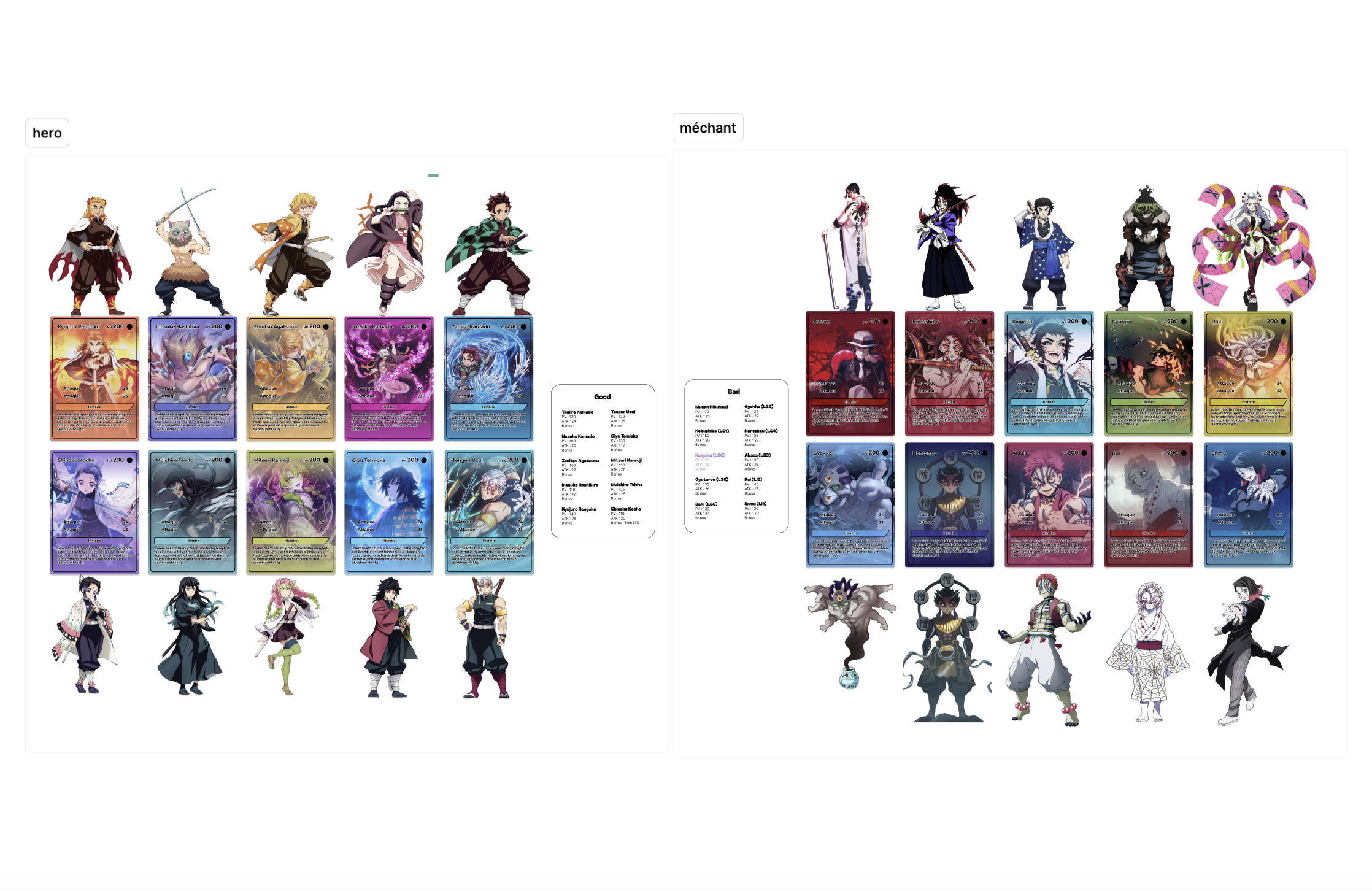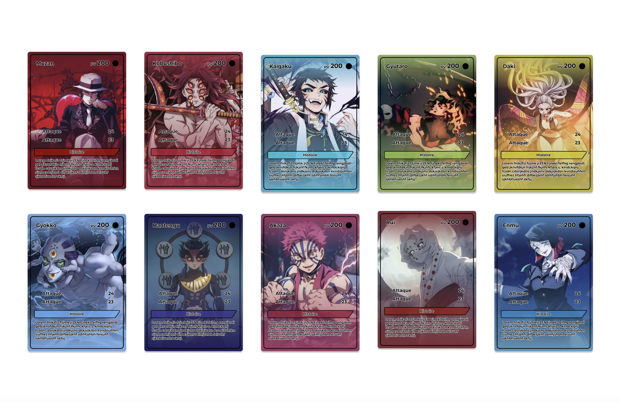 En deuxième année, on a pu faire un jeu de cartes sur le thème qu'on souhaitait. J'ai donc décidé de le faire sur le thème du manga Demon Slayer avec pour inspiration les cartes Pokémon. Ce projet est toujours en cours, puisque je souhaite faire un site de jeu de tour par tour sur ce même thème.