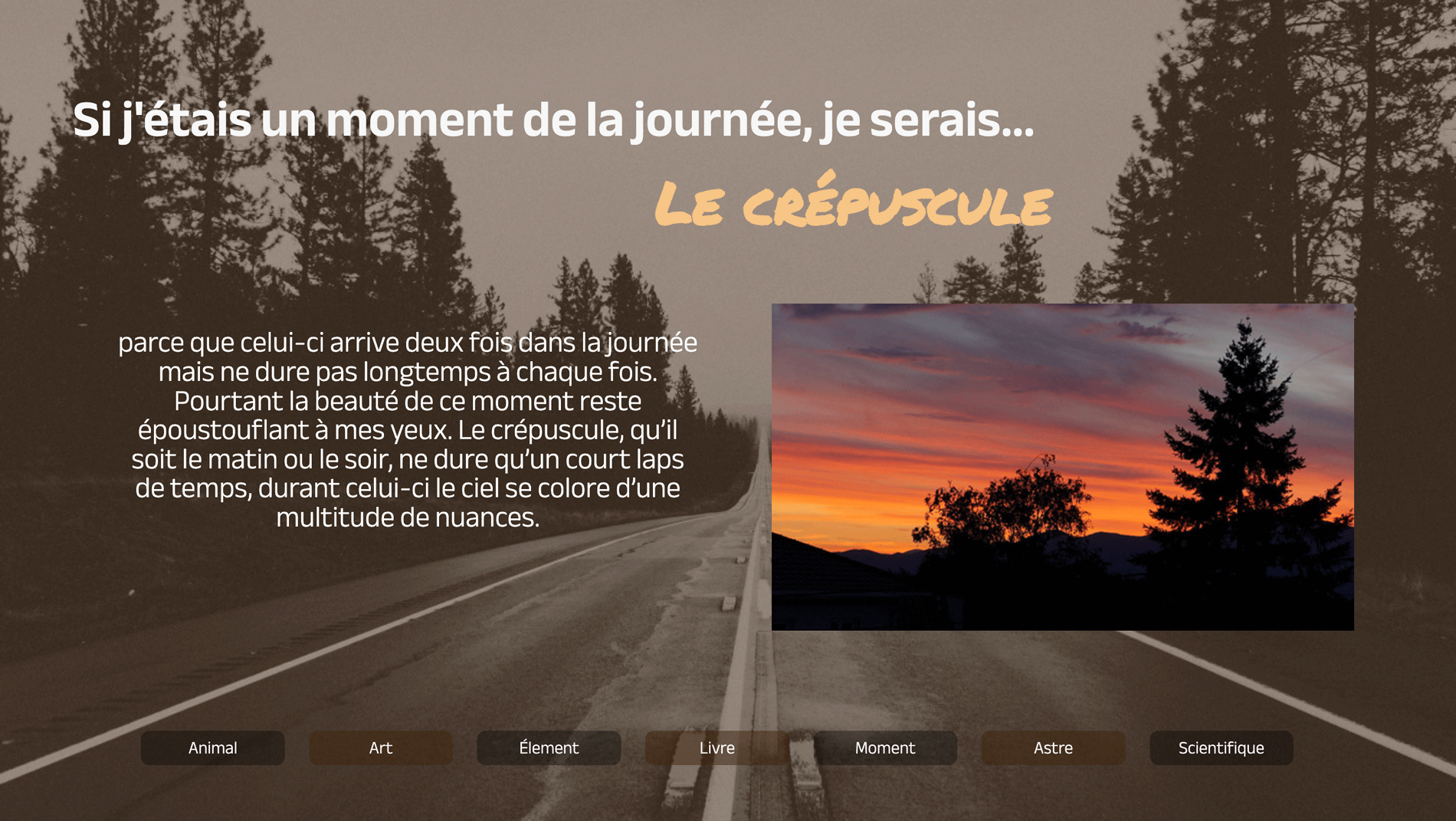 Lors de ce projet, j'ai pu appliquer les connaissances acquises en cours, notamment l’HTML, CSS et le JavaScript. Il m’a permis d’en apprendre plus sur moi à travers la recherche d'analogies.