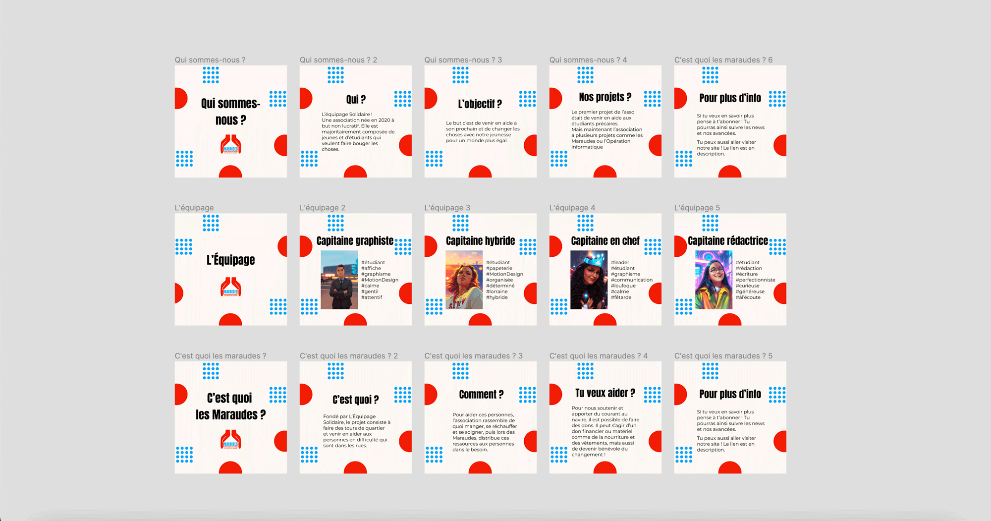 Dans le cadre d'un projet de groupe en première année de BUT, nous avons dû choisir un projet citoyen pour créer et mettre en œuvre sa communication. Avec mon groupe, nous avons sélectionné le projet 'Maraudes' de L’Équipage Solidaire pour lequel nous avons créé un site avec WordPress, une vidéo en motion design, ainsi que quelques posts pour les réseaux.